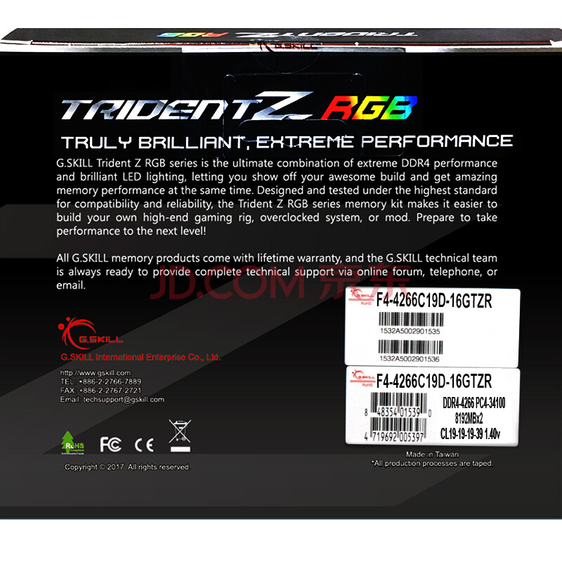 芝奇(G.SKILL)幻光戟系列 DDR4 4266频率 16G(8Gx2)套装 台式机内存 RGB灯条(F4-4266C19D-16GTZR)