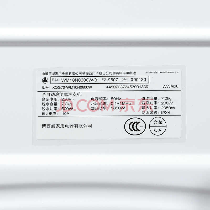 西门子(SIEMENS) 7公斤 变频滚筒洗衣机 静音 防过敏程序 一键自清洁(白色)XQG70-WM10N0600W