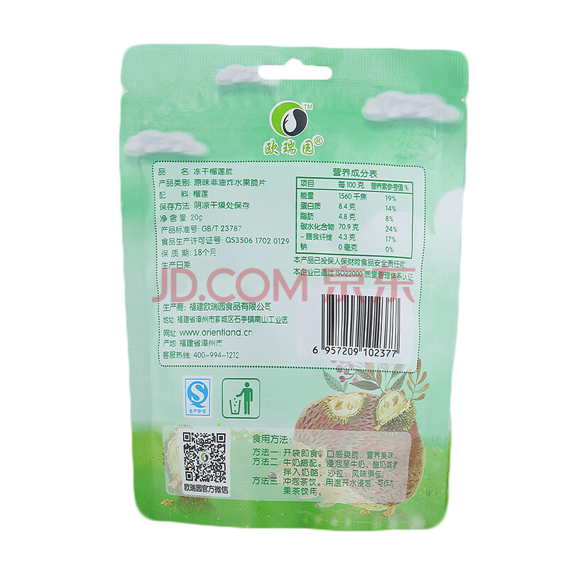 欧瑞园 儿童零食 非油炸水果干 冻干榴莲脆 榴莲干20g/袋