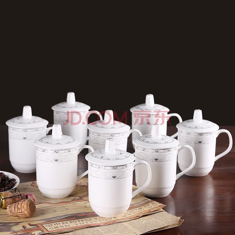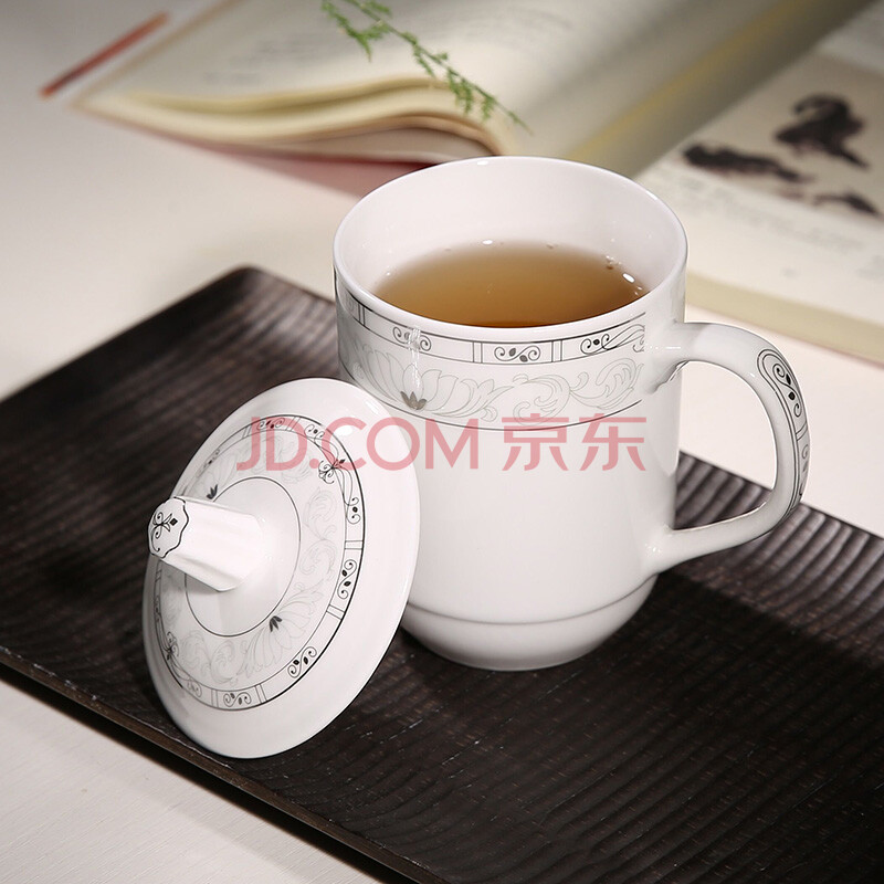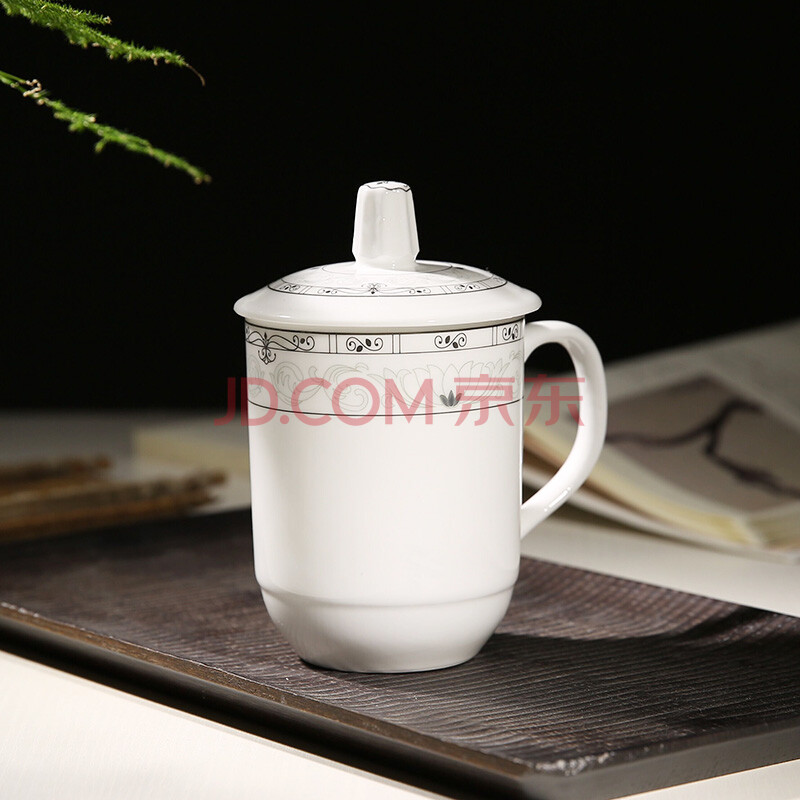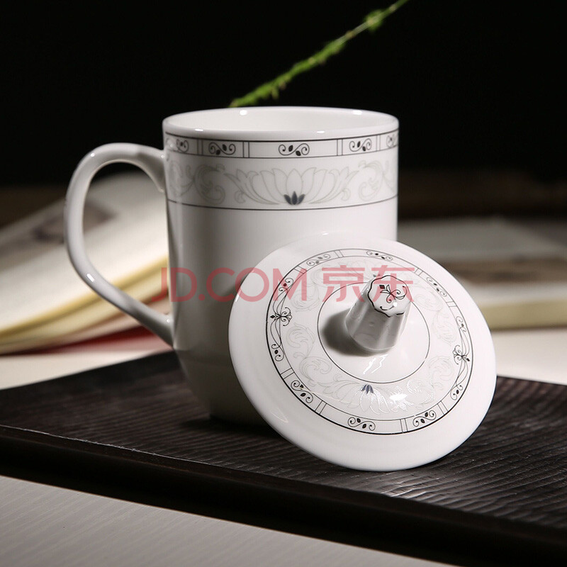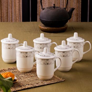 乐享 茶杯陶瓷中号盖杯6只装商务会议办公水杯马克杯子青莲