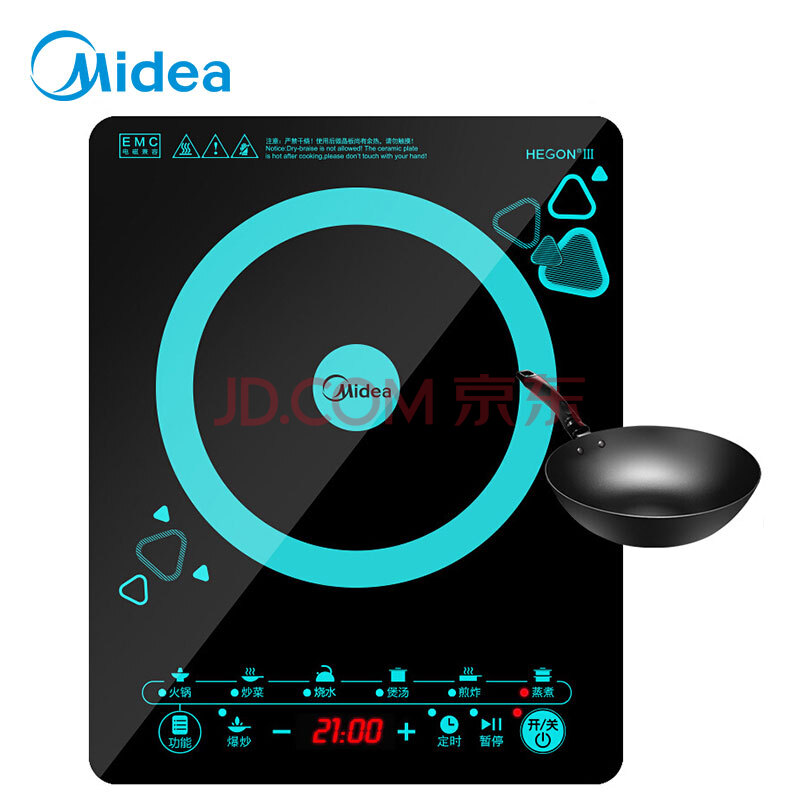美的(Midea)电磁炉 纤薄触控 汉森亚光面板 聚能复式线盘 四重防水 定时功能 C21-WT2120(标配渗氮炒锅)