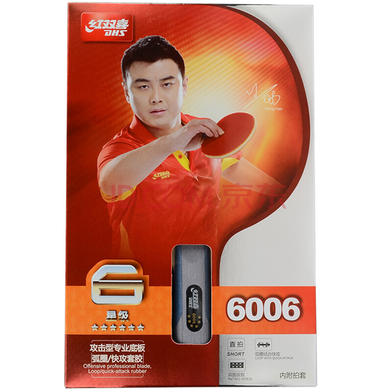 红双喜DHS 6星双面反胶乒乓球直拍 弧圈结合快攻乒乓球拍 A6006 单只拍 赠拍套