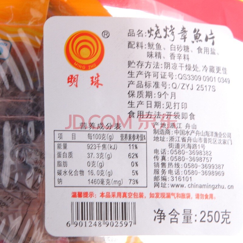 舟山特产 明珠 休闲食品 烧烤章鱼片 250g/袋