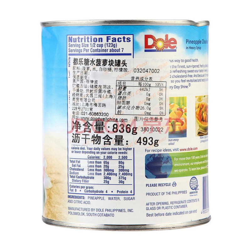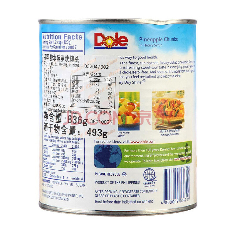菲律宾进口 都乐(DOLE)罐头 水果罐头 糖水菠萝块罐头836g