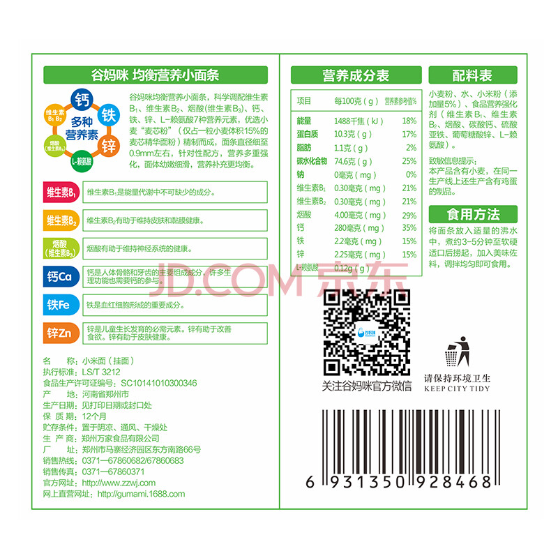 谷妈咪无盐小米面 宝宝婴幼儿营养辅食小面条(6个月以上适用) 280g/袋
