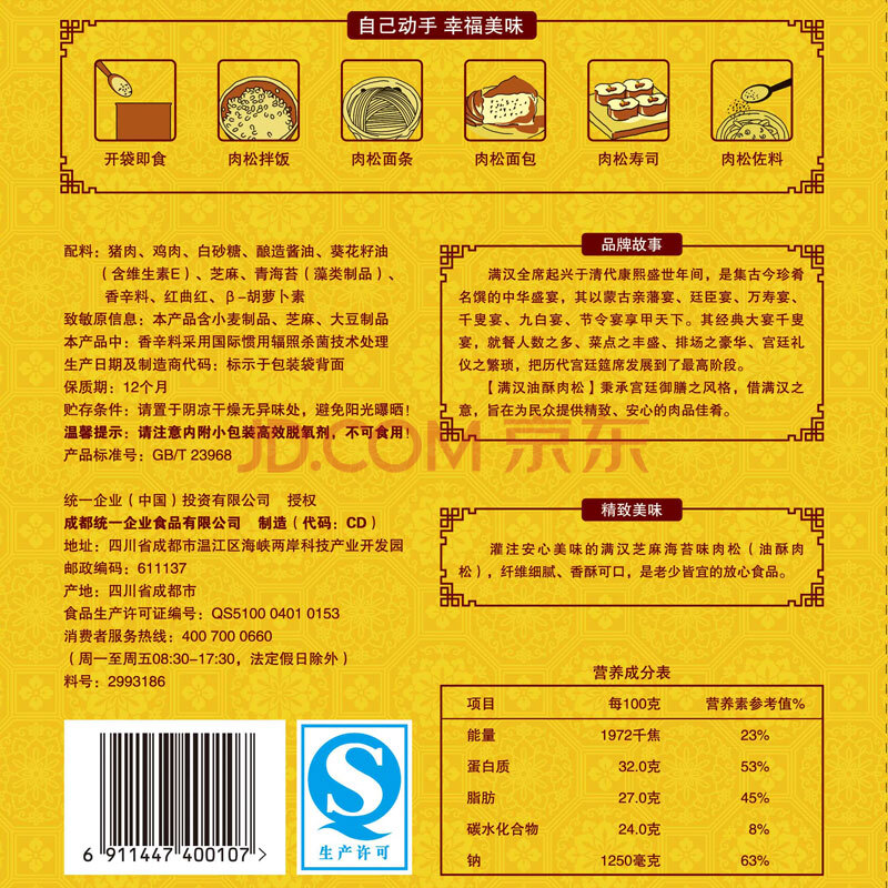 统一 满汉 芝麻海苔味肉松 100克(油酥肉松)