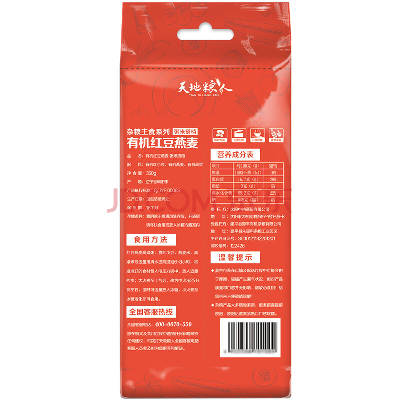 天地粮人 有机 红豆燕麦 杂粮粥米搭档350g(红小豆 燕麦米 高粱米 东北 五谷 杂粮 粗粮 真空装 大米伴侣)