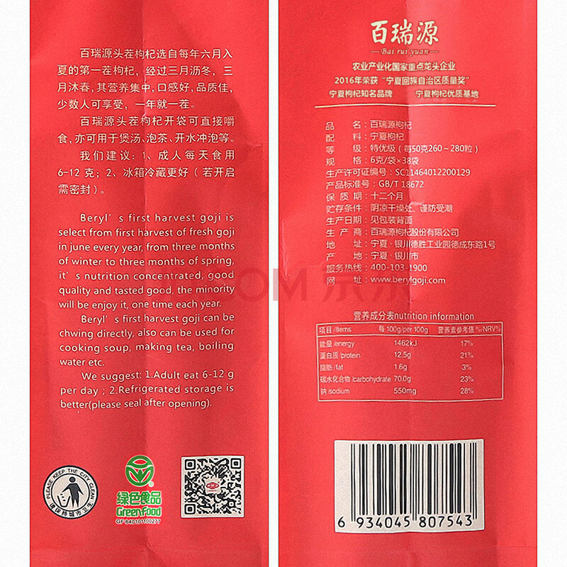 百瑞源 宁夏枸杞 头茬免洗特优级 中宁枸杞228g(6g*38袋)