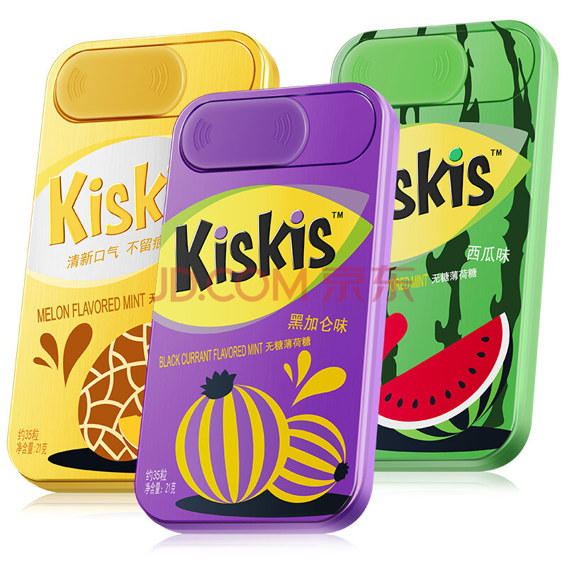 酷滋Kiskis无糖薄荷糖(哈密瓜味、黑加仑味、西瓜薄荷味组合装)21g*3盒