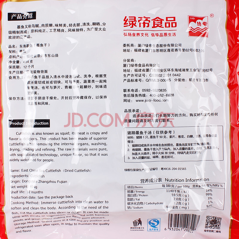 绿帝 东海墨鱼干乌贼淡晒福建漳州海产品特产海鲜干货目鱼干454g