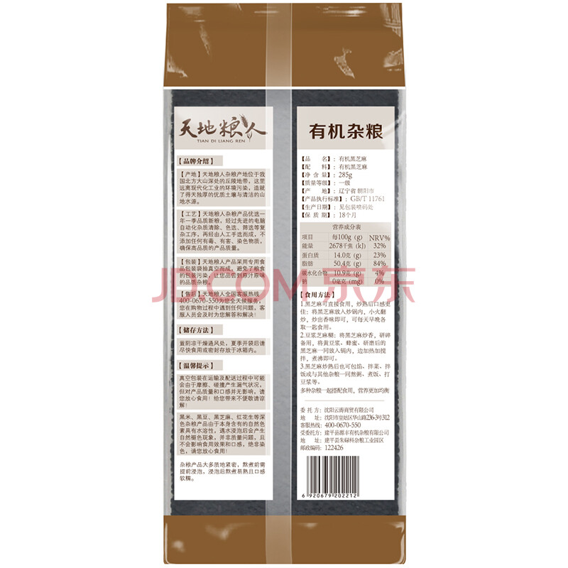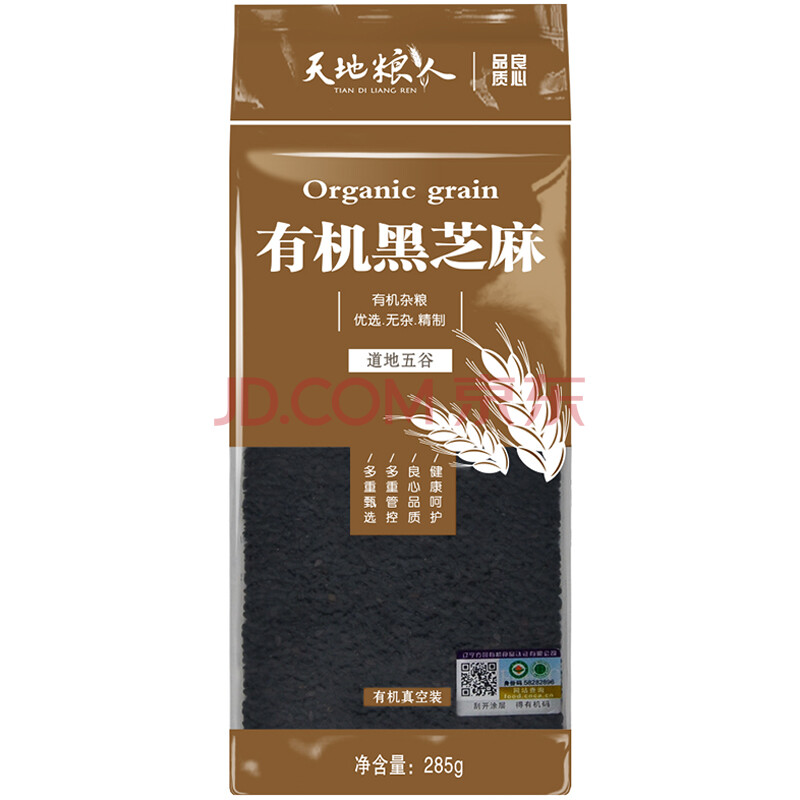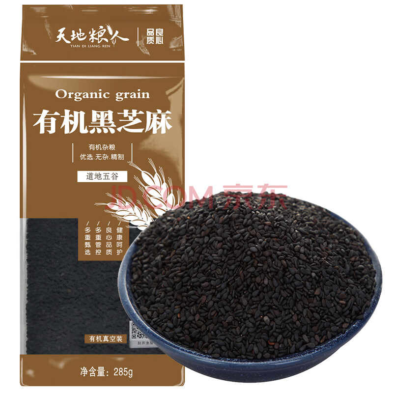天地粮人 有机 黑芝麻 285g(无添加 无染色 东北 五谷 杂粮 粗粮 真空装 大米 粥米伴侣)