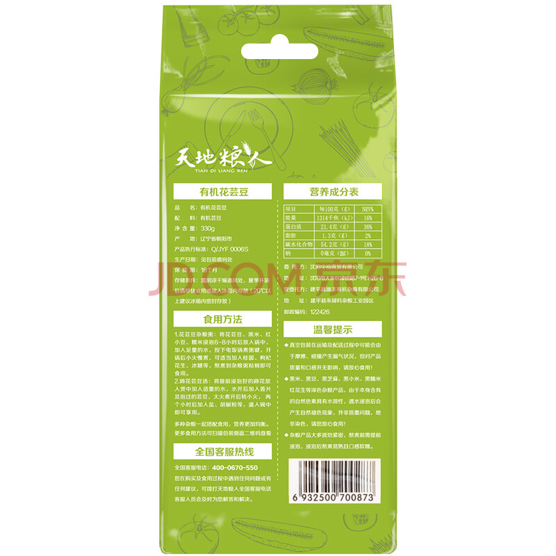 天地粮人 有机 花芸豆 330g(无添加 无染色 饭豆 花腰豆 东北 五谷 杂粮 真空装 大米伴侣)