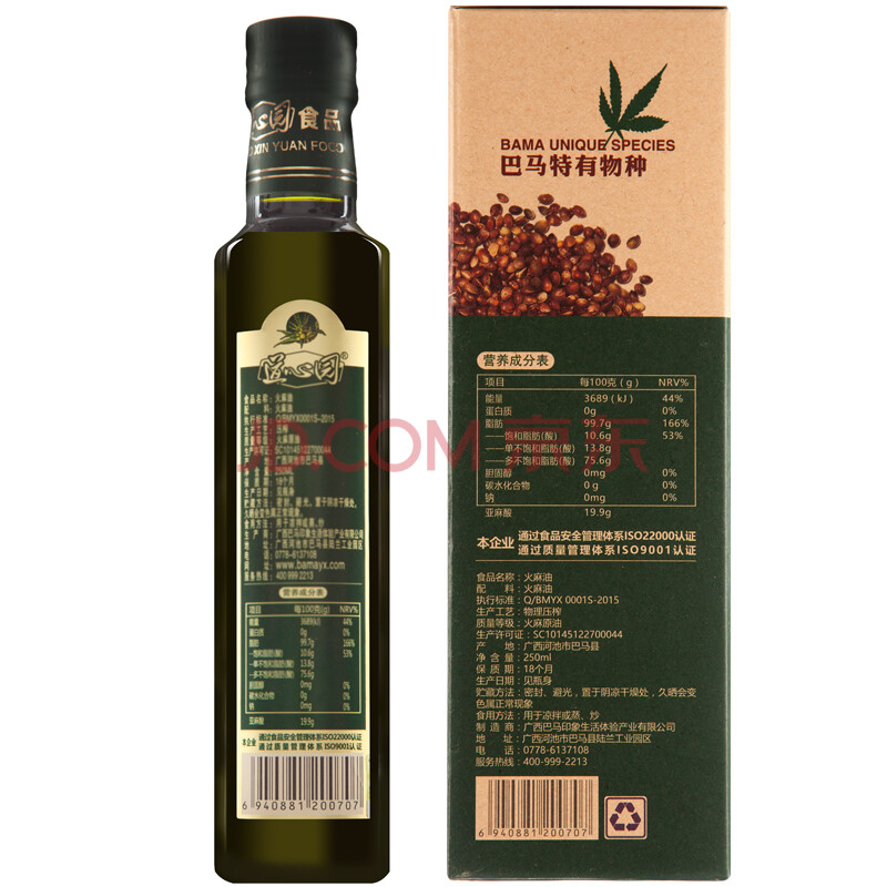 道心园 广西巴马火麻油 低温压榨山丝线丝火麻籽油 火麻仁油250ml