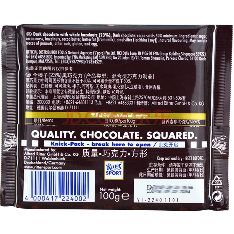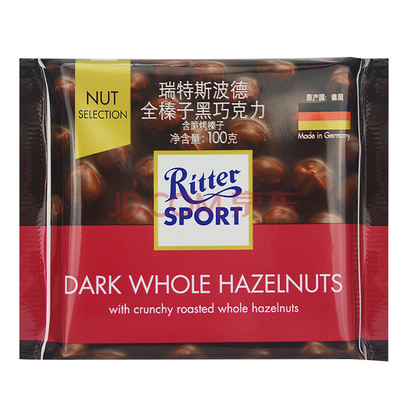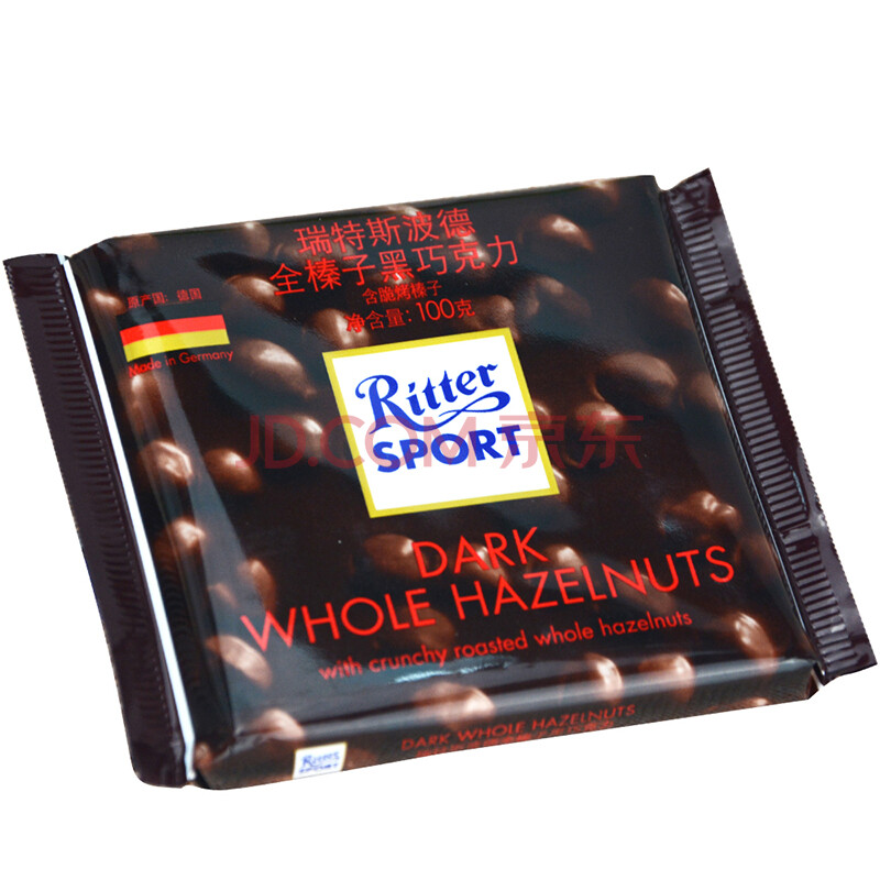 德国进口RitterSport瑞特斯波德全榛子黑巧克力100g